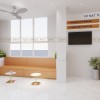Ngoài ra, khu vực này còn được trang bị màn hình TV treo tường để phát video hướng dẫn, quảng cáo kính hoặc thông tin chăm sóc mắt. Cách bố trí này giúp tận dụng thời gian chờ hiệu quả và tăng mức độ nhận diện thương hiệu trong tâm trí khách hàng.