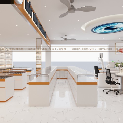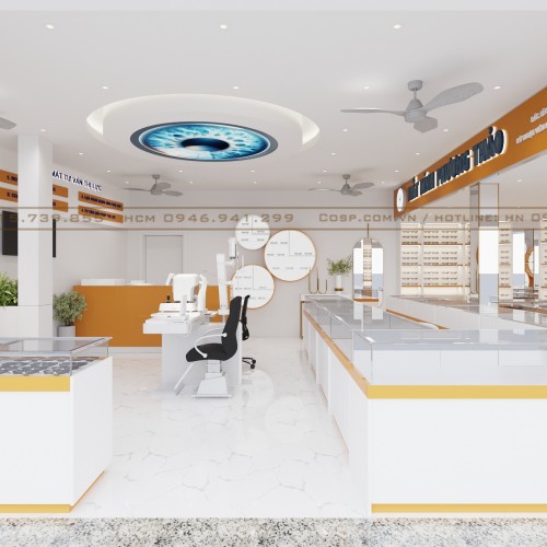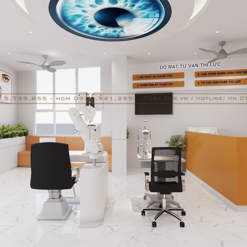 Một trong những điểm mạnh của thiết kế nội thất tại đây là khu vực đo khúc xạ và tư vấn thị lực. Các thiết bị đo mắt hiện đại được bố trí khoa học, đảm bảo luồng di chuyển thuận tiện mà vẫn đảm bảo sự riêng tư. Không gian này được nhấn bằng trần thạch cao dạng vòng tròn với hình ảnh con ngươi mắt 3D đầy ấn tượng.