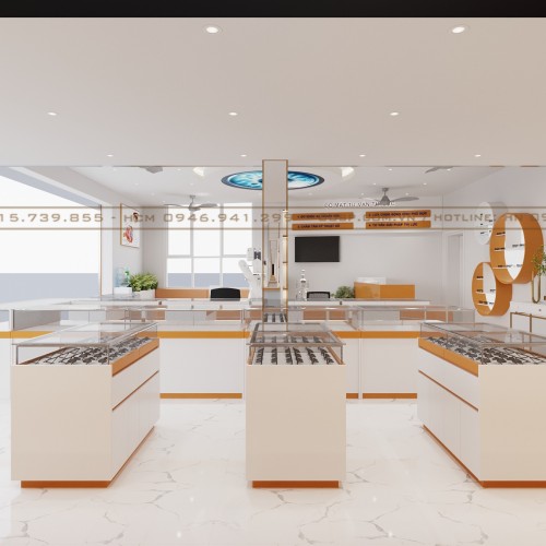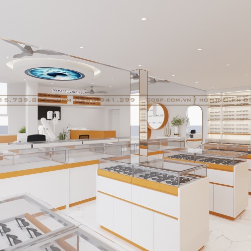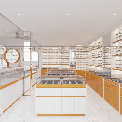 Tông màu chủ đạo của tiệm kính là trắng và cam, sự kết hợp tạo nên không gian hiện đại, sạch sẽ và gần gũi. Màu trắng giúp không gian thêm rộng và sáng, trong khi màu cam mang đến sự ấm áp, thân thiện. Đây cũng là hai màu được dùng nhất quán từ mặt tiền, logo, quầy kệ cho đến nội thất bên trong thể hiện sự chỉn chu và đồng bộ trong thiết kế thương hiệu.