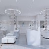 Các khung gương cong bo tròn, phối hợp với kệ trắng giúp tổng thể nhẹ nhàng, phù hợp với tệp khách hàng trẻ và văn minh. Nhờ sử dụng gương đúng vị trí, ánh sáng trong cửa hàng cũng phản xạ tốt hơn, giúp không gian luôn sáng và sạch.