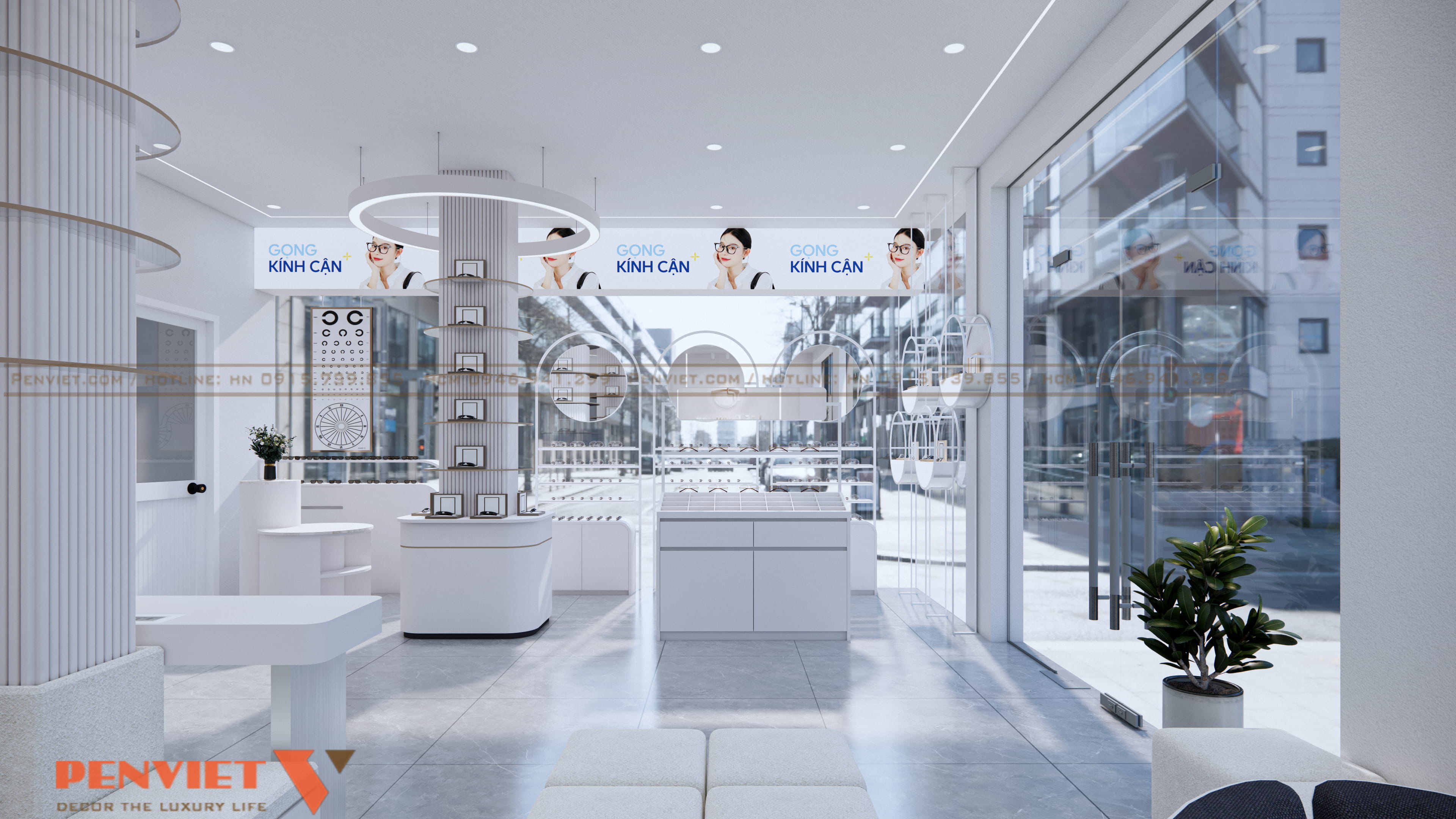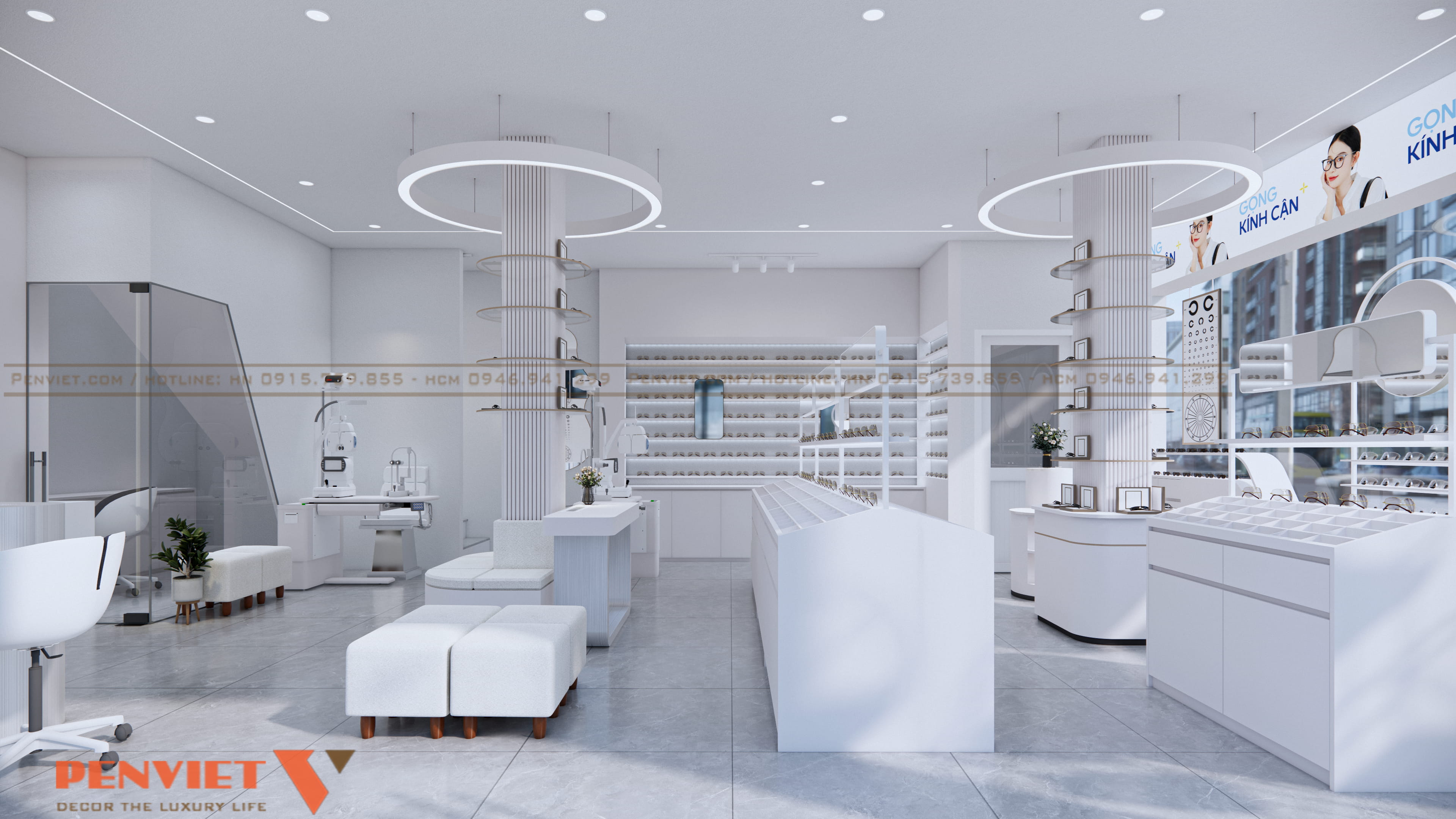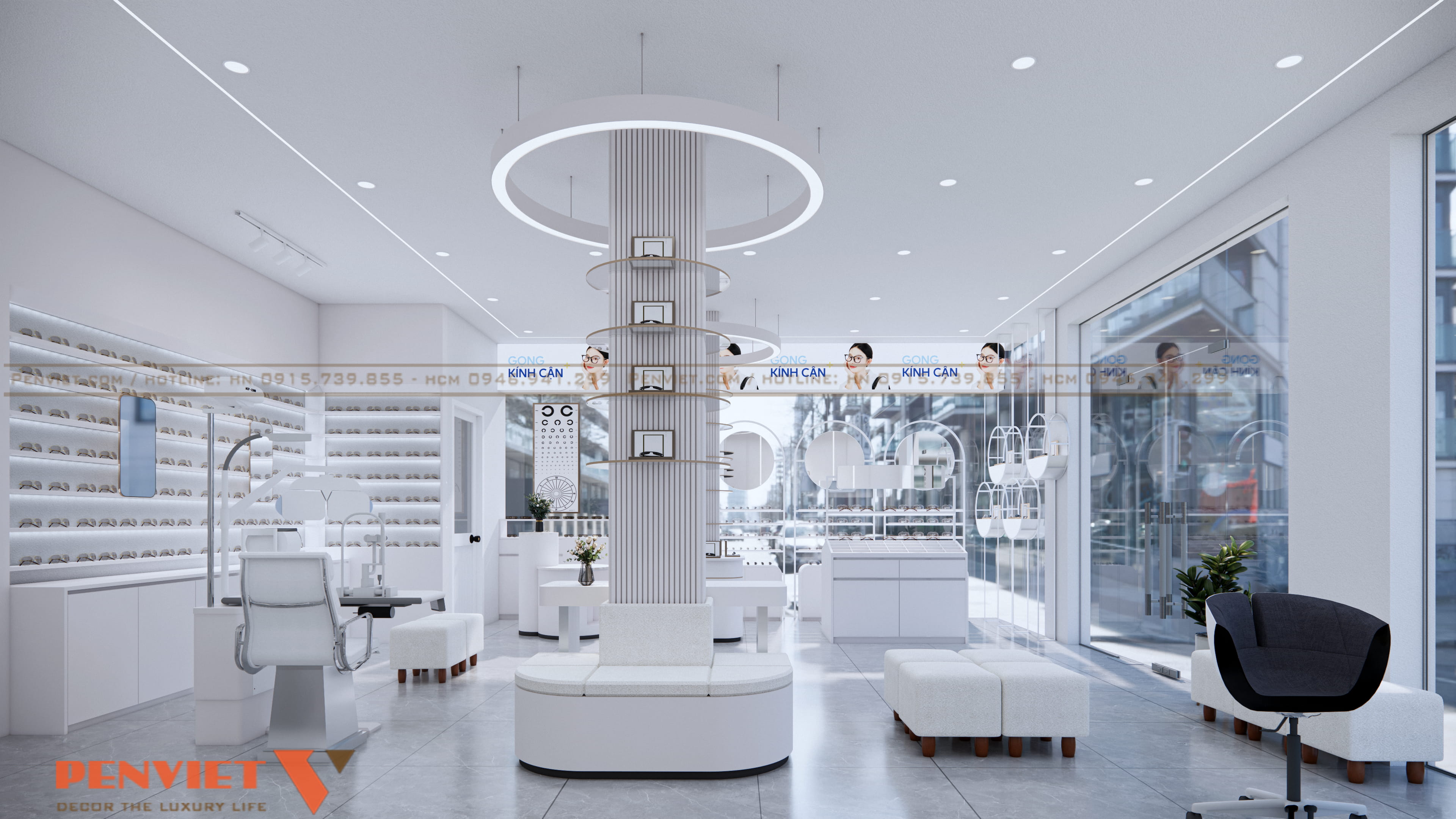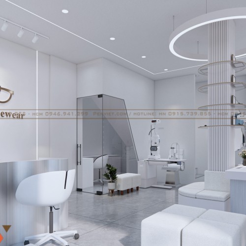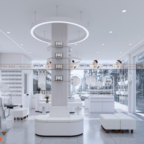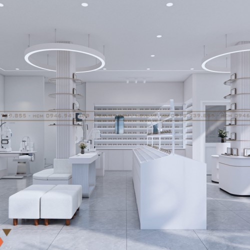 Xuyên suốt dự án là gam trắng chủ đạo. Màu trắng làm cho cửa hàng sạch hơn, sáng hơn và mang nét chuyên nghiệp đặc thù của ngành mắt kính. Tường, tủ, quầy, ghế… đều được thống nhất, tạo cảm giác đồng bộ và dễ nhận diện thương hiệu.