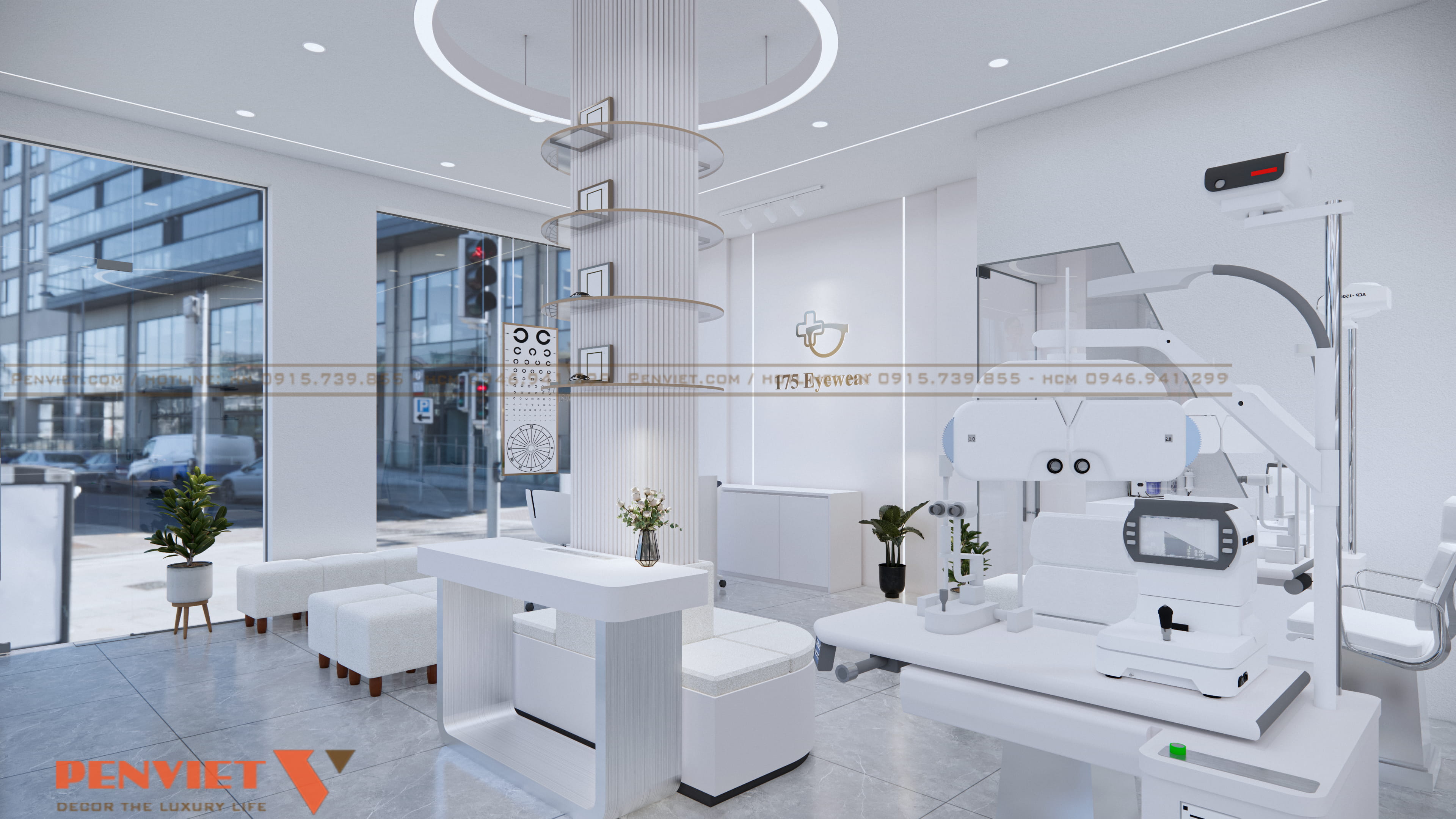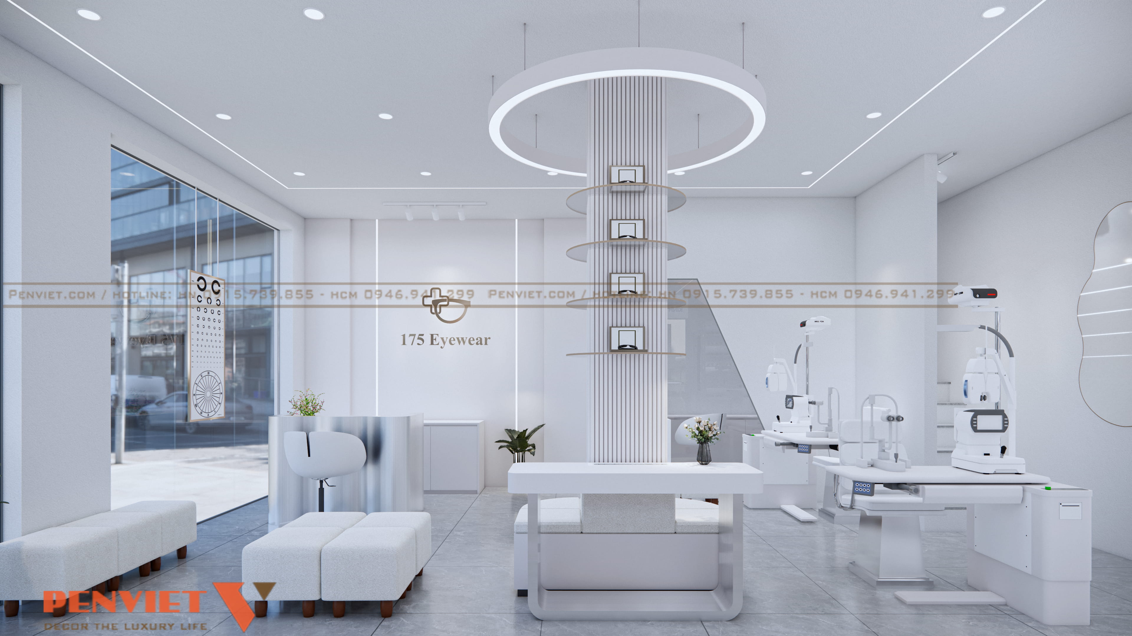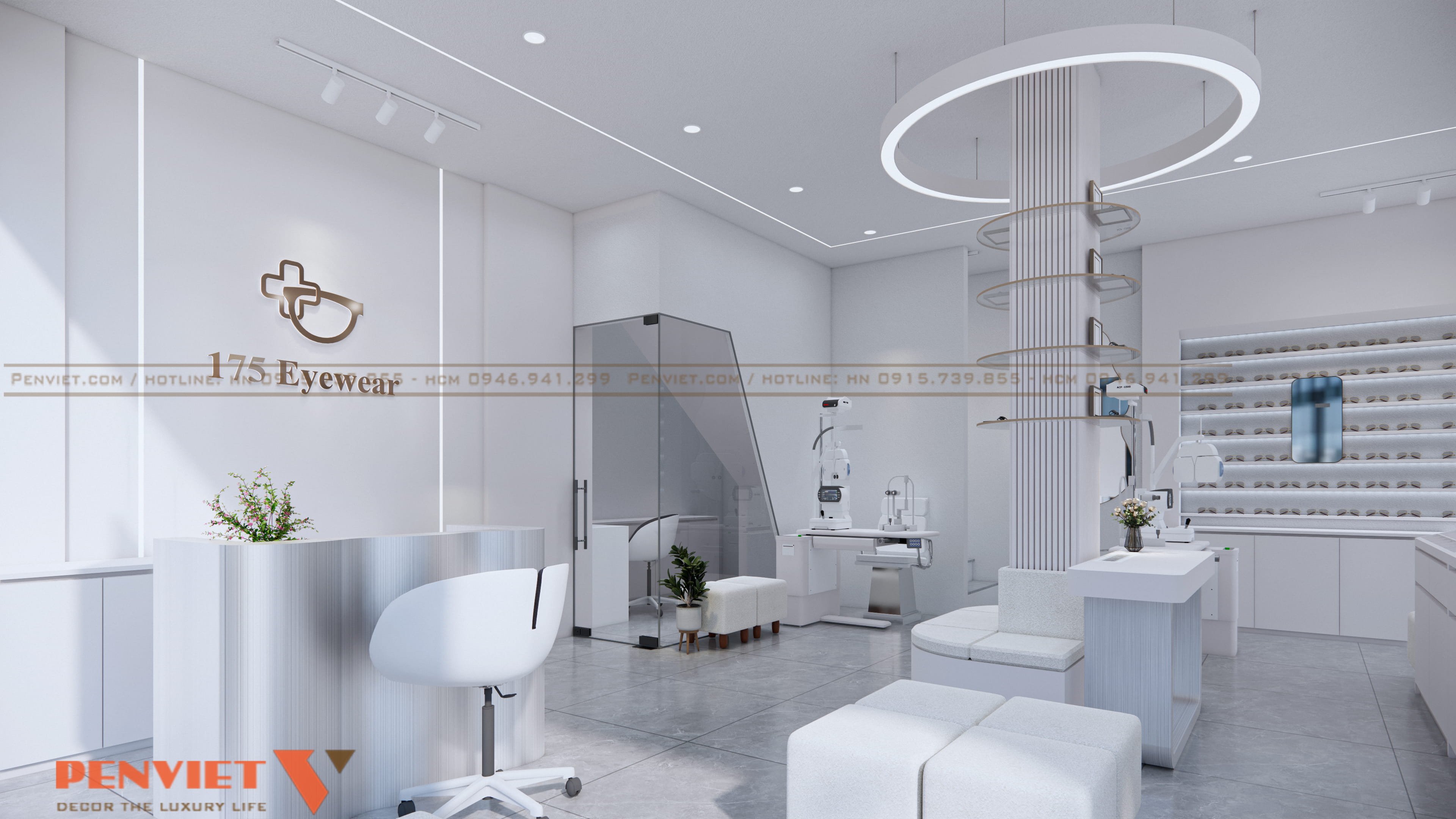 Xuyên suốt dự án là gam trắng chủ đạo. Màu trắng làm cho cửa hàng sạch hơn, sáng hơn và mang nét chuyên nghiệp đặc thù của ngành mắt kính. Tường, tủ, quầy, ghế… đều được thống nhất, tạo cảm giác đồng bộ và dễ nhận diện thương hiệu.