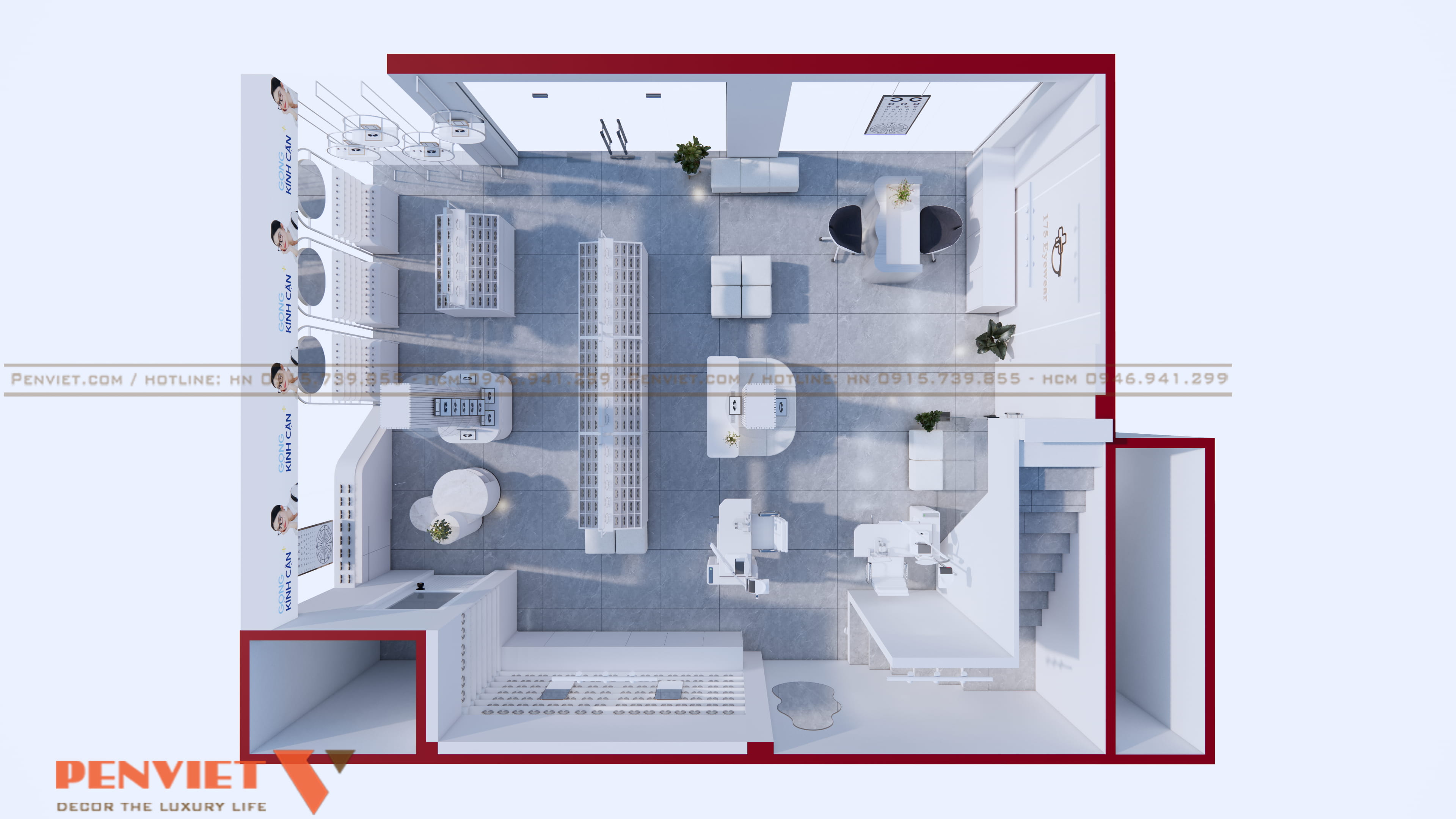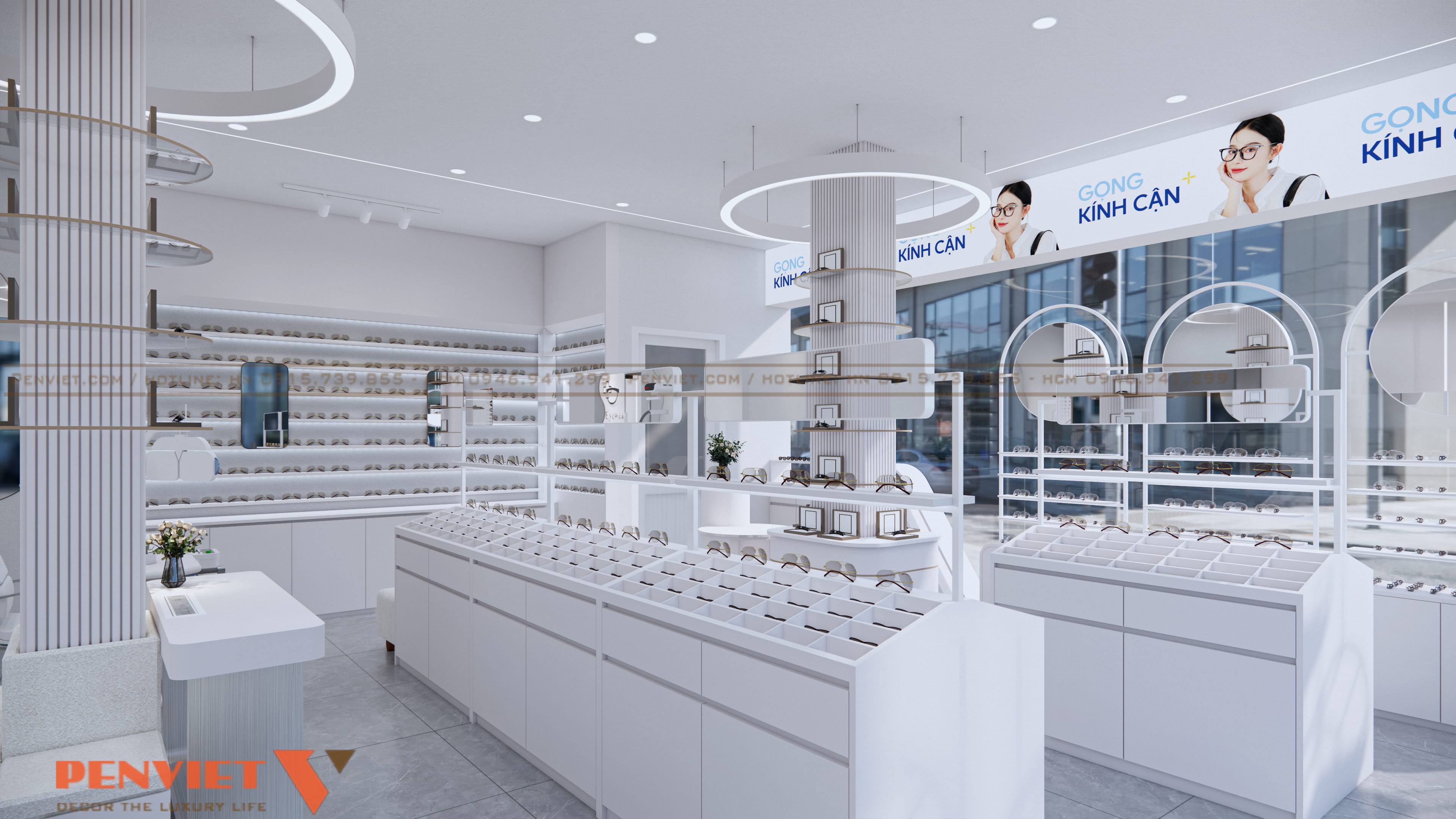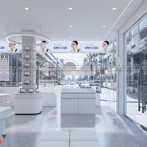 Nhờ sự tối giản về màu sắc, các sản phẩm gọng kính được nổi bật rõ rệt, giúp khách dễ lựa chọn hơn. Màu trắng cũng giúp ánh sáng phản xạ tốt, giảm tiêu hao điện năng và hỗ trợ mắt khách hàng nhìn sản phẩm chính xác.