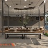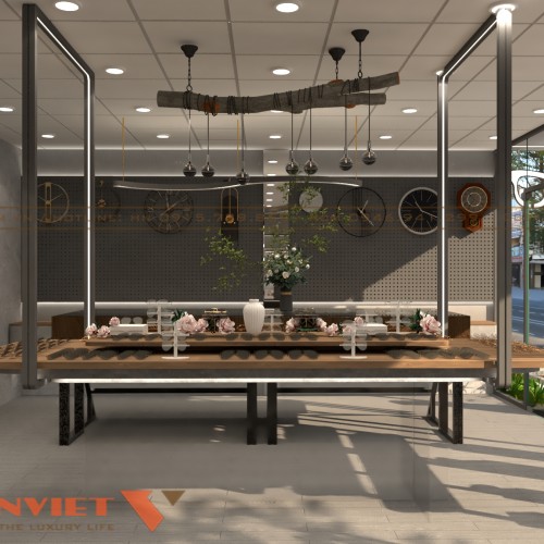 Các chi tiết trang trí như bình hoa lớn, hoa giả, tiểu cảnh cây xanh và đồng hồ treo tường nghệ thuật khá tinh tế. Phía trên, hệ thống đèn trần dạng thả sử dụng các bóng đèn kim loại tròn lồng khung gỗ thô mộc tạo điểm nhấn cho không gian trở nên sống động, vừa cổ điển vừa phá cách.
