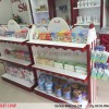 Tủ trưng bày cũng được thiết kế với tông màu trắng, đỏ kết hợp tạo nên nét hài hòa cho tổng thể không gian cửa hàng. Các ngăn tủ và giá treo kết hợp được sắp xếp hợp lý tạo sự thuận tiện cho chủ cửa hàng khi trưng bày sản phẩm.
