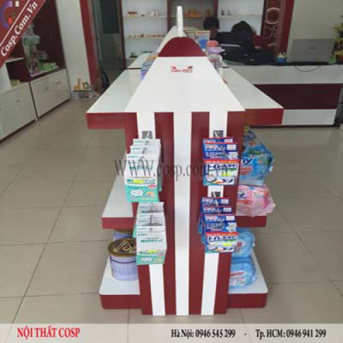 Chất liệu chính sử dụng cho nội thất cửa hàng là gỗ công nghiệp MDF phun sơn. Gỗ công nghiệp MDF với các ưu điểm bền, nhẹ, khả năng chống cong vênh, mối mọt đem lại cho sản phẩm chất lượng cũng như tính thẩm mỹ cao.