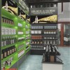 Sự phối hợp giữa màu ghi trầm và xanh lá, cùng hệ thống đèn led, đèn downlight làm nổi bật bộ chữ bằng mica bắt mắt và các mặt hàng thực phẩm chức năng được trưng bày.