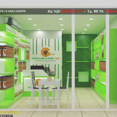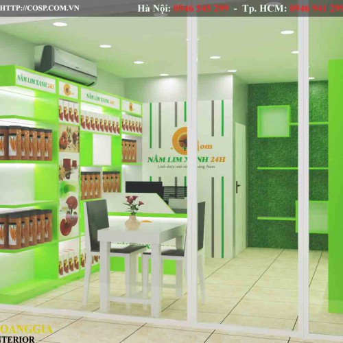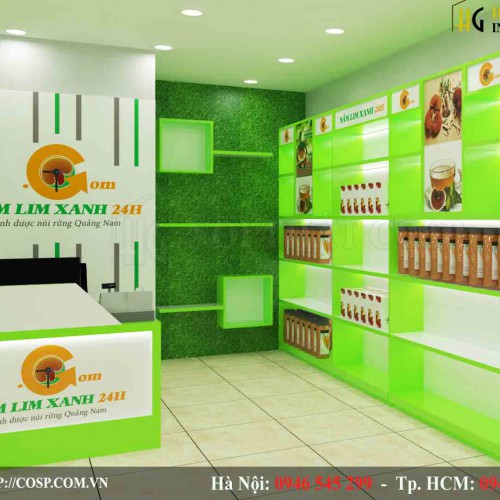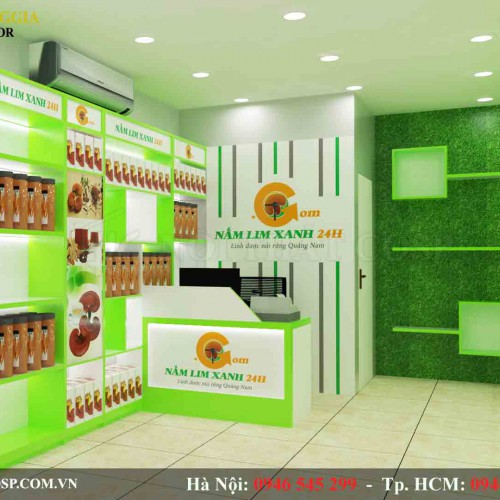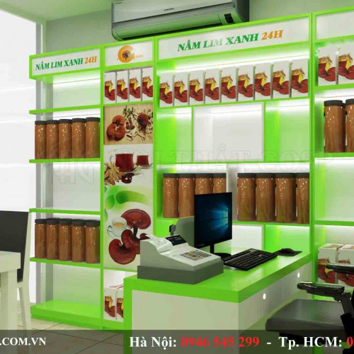 Thiết kế cửa hàng Nấm lim xanh 24H được chúng tôi sử dụng tông màu xanh lá kết hợp với màu trắng thích hợp với những cửa hàng thực phẩm chức năng hay quầy thuốc,.. tạo nên không gian thư thái, trong lành và sạch sẽ đối với những vị khách đến mua hàng.