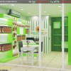 Màu xanh lá cây được sử dụng trong không gian nội thất khá hài hòa thông qua các chất liệu như kính, nhựa và gỗ sơn của hệ thống kệ tủ.