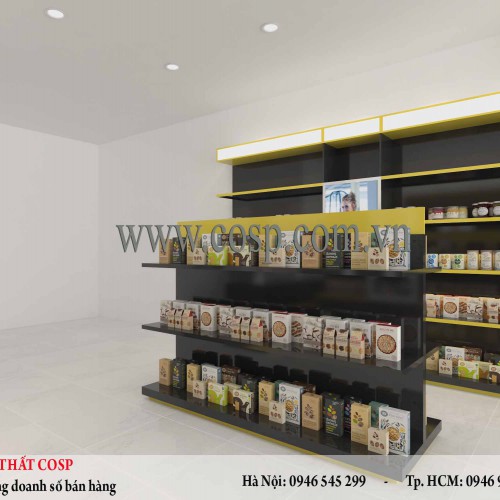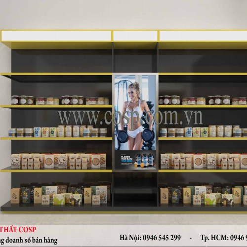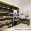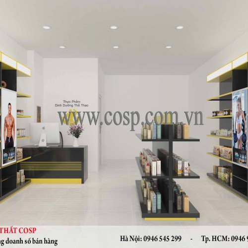 Thiết kế cửa hàng thực phẩm chức năng của anh Trung chuyên các mặt hàng dinh dưỡng thể dục thể thao khi sử sụng hệ thống tủ kệ trưng bày có màu đen sáng viền vàng giúp khách hàng có thể cảm nhận sự chắc khỏe ngay từ khi nhìn vào hệ thống tủ kệ trưng bày.